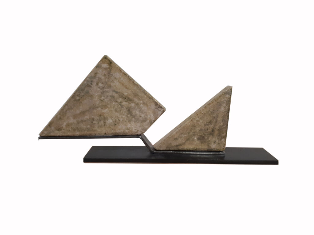 Base de hierro en forma de escalón sobre la que reposan dos piezas geométricas de gres esmaltado. La obra habita un estado intermedio, de tensión contenida y espera.